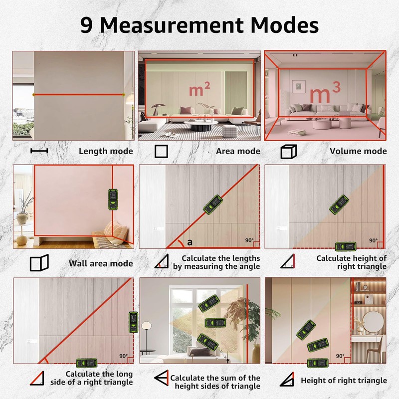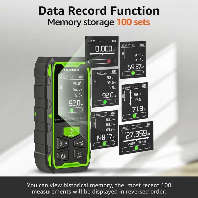 Huepar Laser Measure 396FT Laser Measuring Tool Digital Laser Distance Meters with 2 Bubble Levels, Backlit LCD, Measure Distance, Area and Volume and Pythagorean Mode SW-210RT
