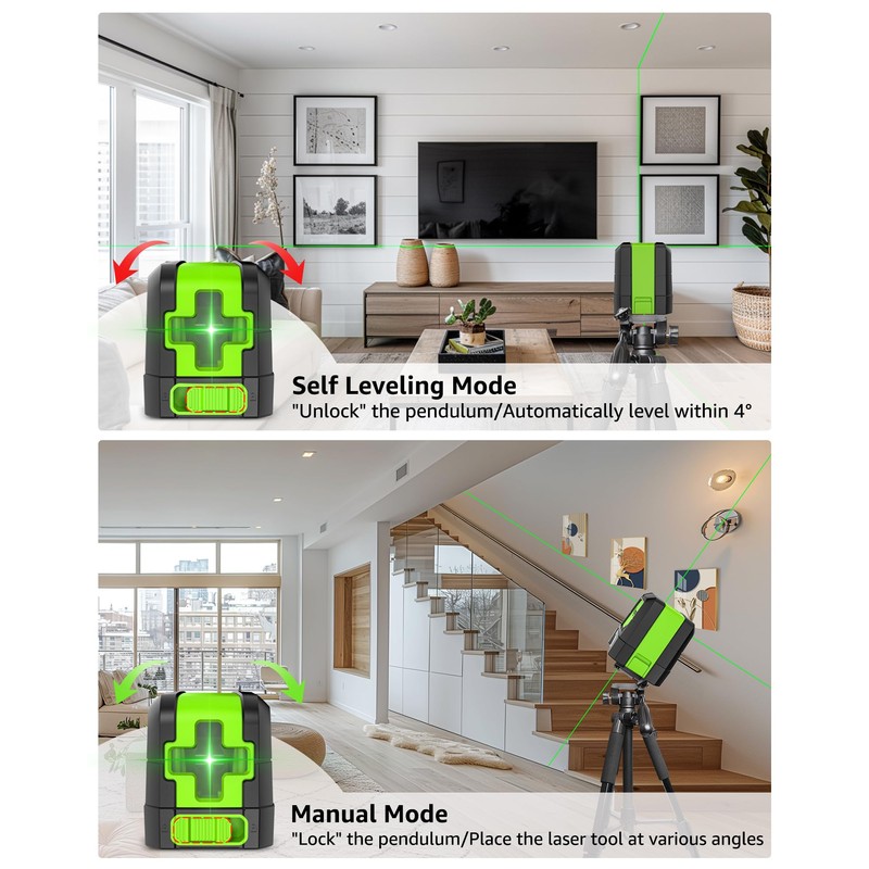 - High Accurancy Self Leveling Laser: This cross line laser level projects a laser cross with an accuracy of 1/9 of an inch at 33 feet and full brightness for optimal visibility. Just slide the pendulum to unlocked position the tool will instantly project a straight cross line onto the wall with 110° angle and self-leveling in ±4°. When you slide it to a locked position, the laser will convert to a manual leveling mode. You can project lines in any angle
