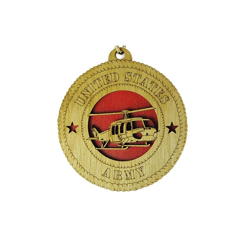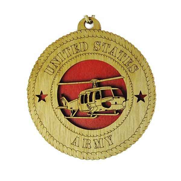 Each ornament is made and assembled in the USA from Baltic Birch. They are finished using golden oak stain. The ornament is assembled in layers resulting in an eye-catching 3D effect and the brightly colored background accentuates the intricate engraving of a Huey Helicopter.