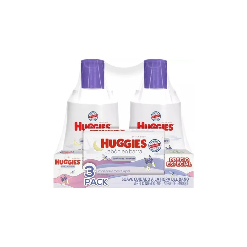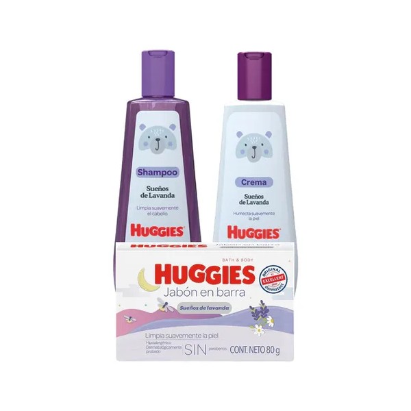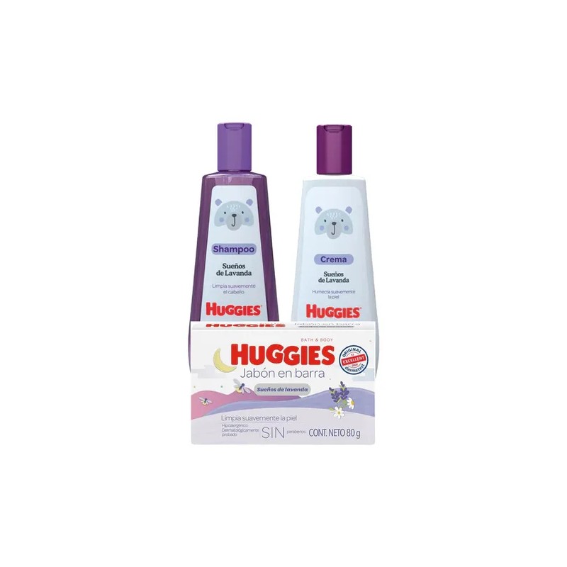 Descripción Set Huggies Sueños de Lavanda contiene Shampoo Huggies Sueños de Lavanda 250 ml + Crema Huggies Sueños de Lavanda 250ml+ Jabon en barra 80 g Ingredientes de origen natural Con lavanda, caléndula y manzanilla. Para todo tipo de cabello Fórmula hipoalergénica Libre de parabenos y químicos dañinos que podrían afectarlo. Dermatológicamente probado.