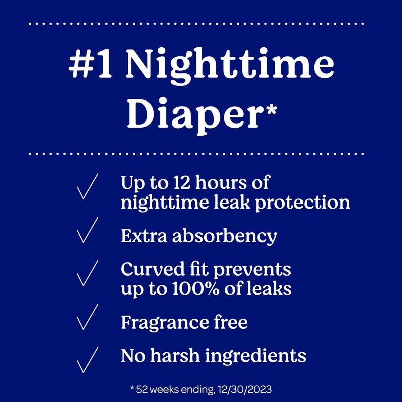 - Nighttime Diapers Designed for Comfort: Curved shape plus Double Grip Strips deliver a secure fit; also features a wetness indicator to let you know when it's time for a diaper change