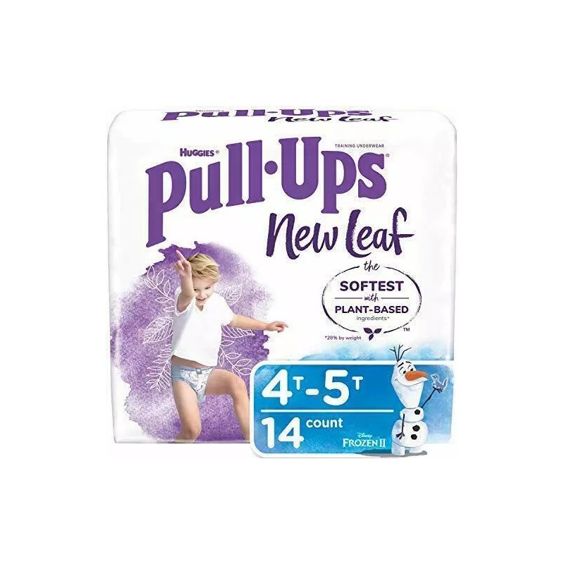 Introducing Pull-Ups New Leaf Training Pants, the softest training underwear made with plant-based ingredients* for healthy skin. Clinically proven to be hypoallergenic and made without harsh ingredients, New Leaf training pants provide up to 12 hours of outstanding leak protection. Designed to help keep your child comfortable while potty training, New Leaf training pants are made with a cottony-soft & breathable material with high absorbency—because once they're comfortable, Confidence Comes Naturally. Pull-Ups New Leaf training pants also feature an underwear like design for easy up & down motion that helps promote learning and Big Kid independence. Plus soft, refastenable sides provide an adjustable waistband for a secure fit and quick changes on-the-go or at home. Featuring your favorite Frozen II characters, each pack includes front & back designs of ’s Olaf, Sven & Kristoff, with wetness indicator graphics that fade when wet for a fun way to help him learn. When your child is ready to begin his potty training journey, the Pull-Ups brand can help. Visit pull-ups for expert articles, tips and potty training resources. We've helped potty train 60 million Big Kids and counting!** Pull-Ups New Leaf Training Pants are available in sizes 2T-3T (16-34 lb.), 3T-4T (32-40 lb.) and 4T-5T (38-50 lb.). (*28% by weight). (**US and Canada)