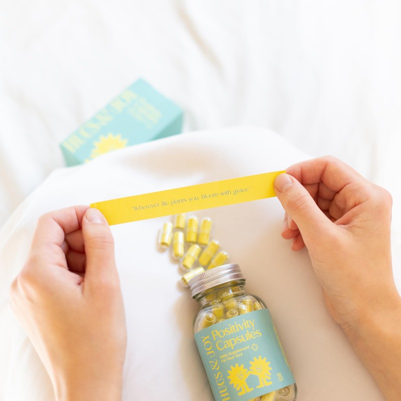 - High-quality workmanship - The Hugs & Joy Positivity capsules come in a premium glass bottle in retro style, perfect for spreading good mood and inspiration!