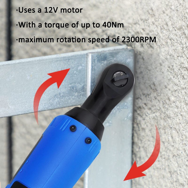 - [High-Performance Cordless Ratchet Wrench] This electric ratchet wrench uses a 12V motor, with a torque of up to 40Nm and a maximum rotation speed of 2300RPM. It can also be used for forward/reverse conversion, which is convenient for easy and quick removal or tightening of nuts and bolts, improving the use efficiency and completing the work faster.