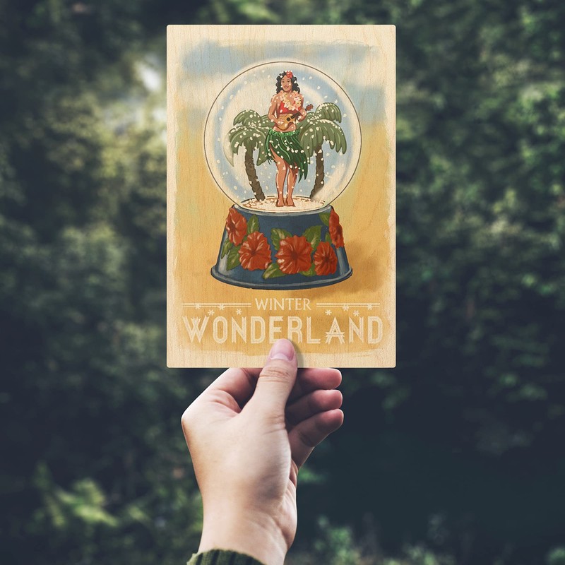 - Hula Girl in Snow Globe, Winter Wonderland (4x6 Birch Wood Postcards, 2-Pack Stationary, Rustic Home Wall Decor), high-quality sustainable wood printed in Seattle