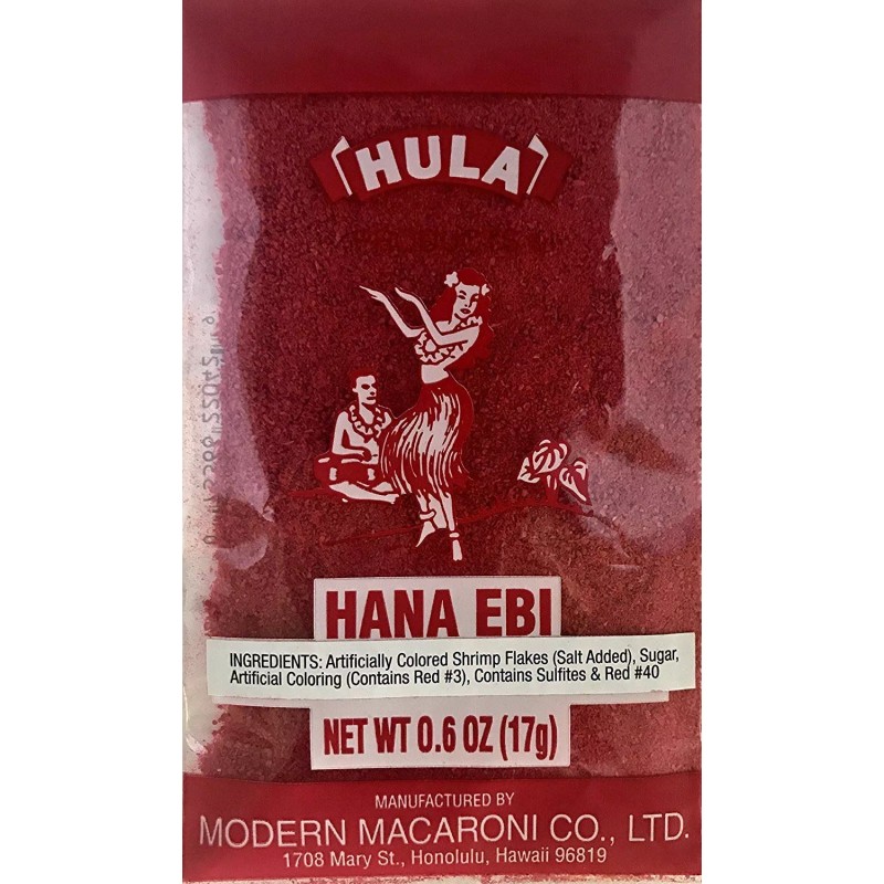 Red shrimp flakes, sprinkle on rice or use in your favorite sushi roll. Hula Brand Red Hana Ebi from Honolulu, HI. .06 oz bag.