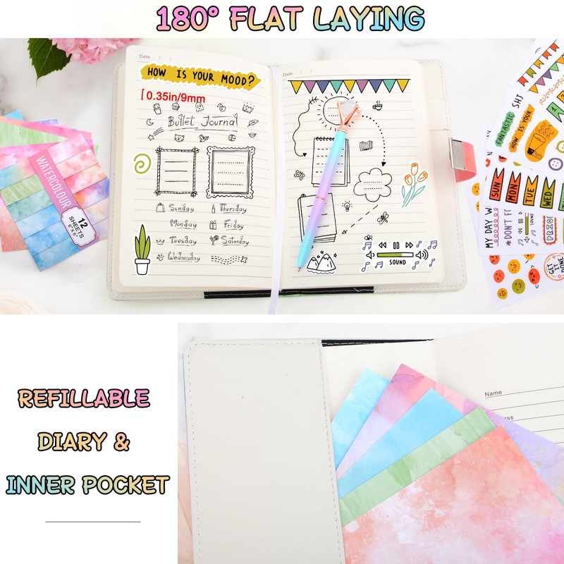 - Girls' travel diary: A5 watercolour diary with lockable diary in a good size (8.47 x 5.71 inches). The journal has 90 sheets (180 pages) of thick paper and is ink blood proof. The girls journal has a waterproof double faux leather cover, interchangeable inner pages and the journal has an elastic pen pocket that hangs from the front cover of the girls journal, making it easy to take notes when travelling.
