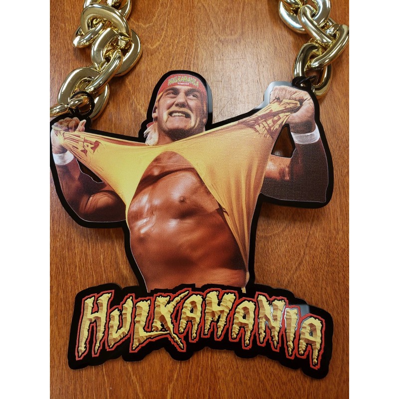 HULKAMANIA lives forever! UV Electroplated Gold Acrylic Chain with large Hulk Hogan Pendant. Pendant is made of acrylic. It is a very nice piece and tribute to Hulk Hogan. A great gift for any Hulk fan!
