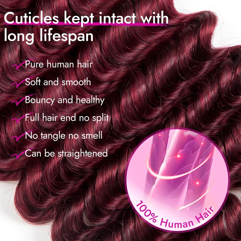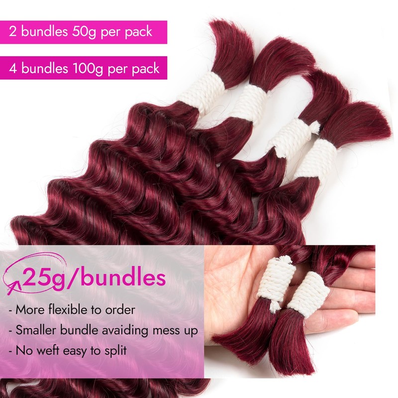 Human Braiding Hair Deep Water Wave 2 Bundles/Pack 50g 18 Inch, Burgundy Red Bulk Human Hair Braiding Hair for Boho Braids, Curly Wet and Wavy Bohemian Human Hair for Braiding Non Weft