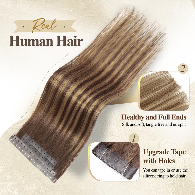 Human Hair Extensions T4/27 Highlight Honey Blonde Remy Human Hair Extensions with Holes Invisible PU Tape in Hair Extensions Glueless Hair Extensions for Women (35g 4Pcs,20 Inch)