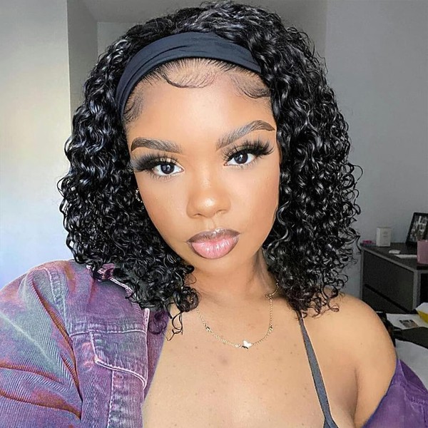 Human Hair Headband Wig No Lace Front Headband Wig Deep Wave Brazilian Curly Wig Curly Wear and Go Glueless Wigs Wigs for Black Women Natural Color 12 Inches