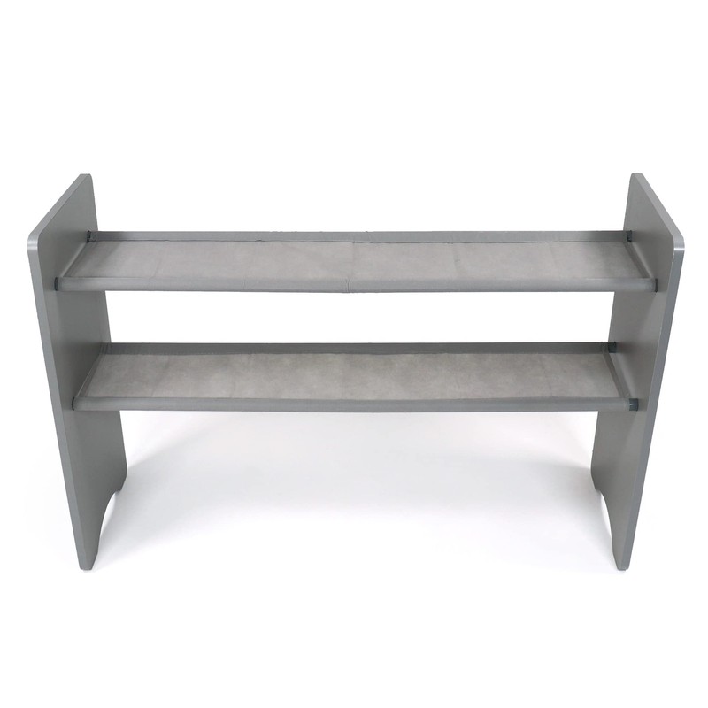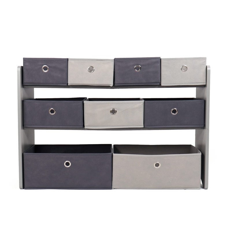 - Grey wooden finish with a blend of dark grey and light grey colored toy bins.