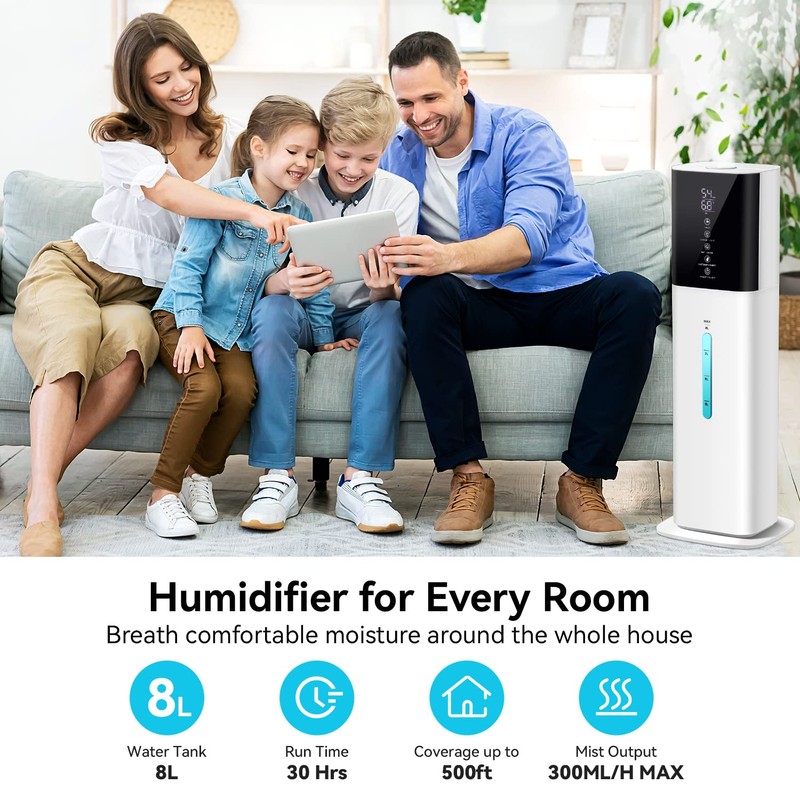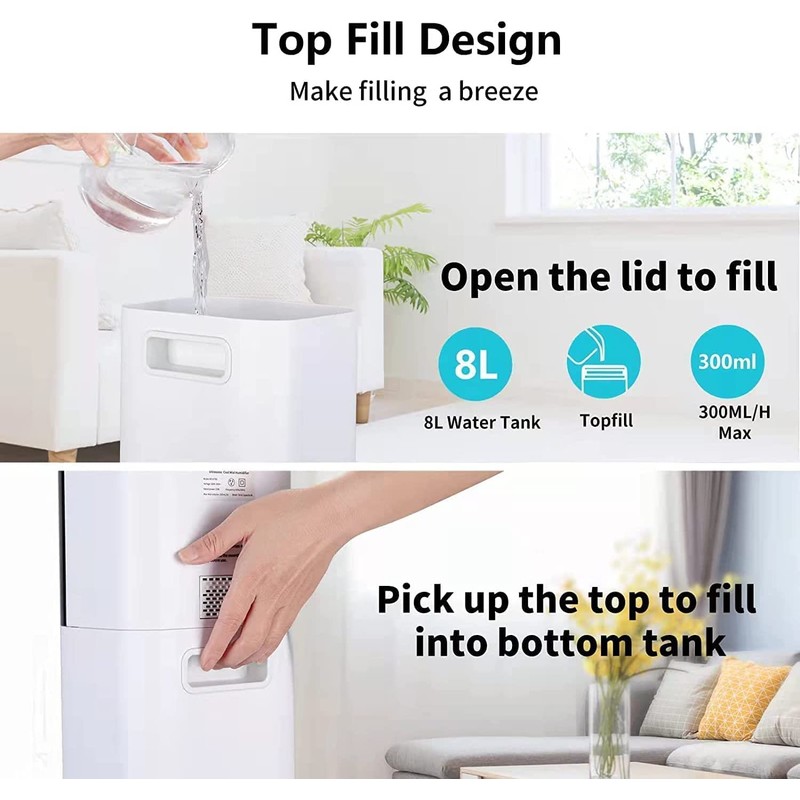 - 【Humidifiers for Large Room & Bedroom】The humidifier with 8L 2.1Gal removable water tank,solve traditional model leakage problem,can cover up to 500 sq ft,powerful mist output of 300ml/h,in the dry season,it can good relieve the dryness of your skin.Top fill design easy to refill,continuously up to 40 hours on a single refill needn't filling water frequently,Best whole house humidifiers for home, dorm and living room!Built-in stone ceremic filter enables it to work don't any replacement filters.