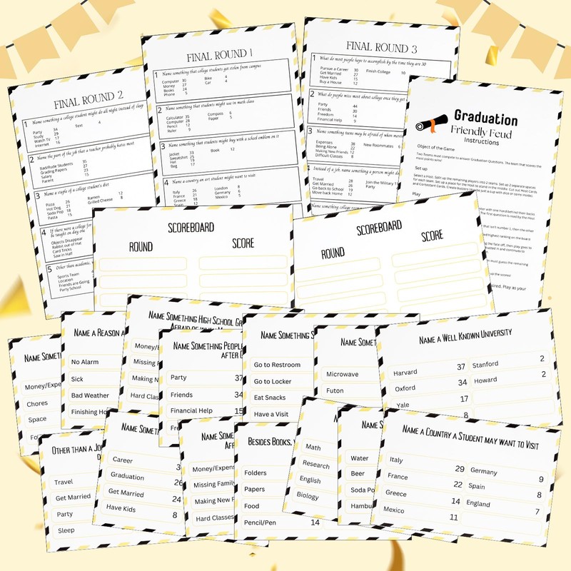 • Graduation Friendly Feud Game Set: enjoy a lively trivia night with our complete set, includes 1 game instruction card, 2 score cards, 20 bible theme question cards and 5 quick final game cards, 28 cards in total for non-stop fun