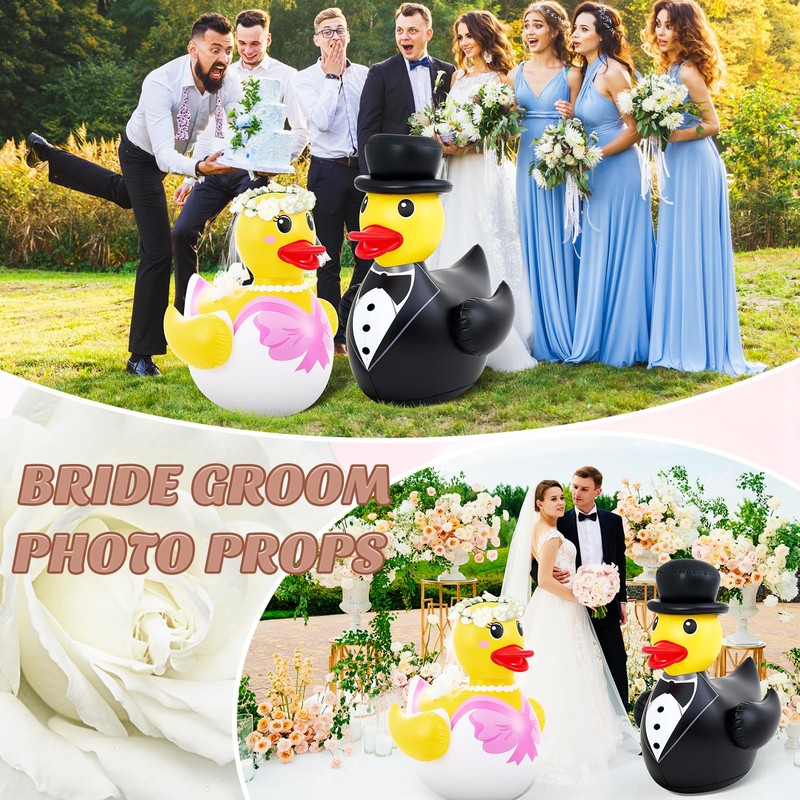 - Versatility and Convenience: our bride and groom decorative ducks are designed to bring joy and comedy to your nuptials; Whether positioned in your yard, on the porch, floating in the pool, or tied to a rooftop, these Weather-resistant inflatable ducks can be placed anywhere, bringing a special touch to your wedding celebration