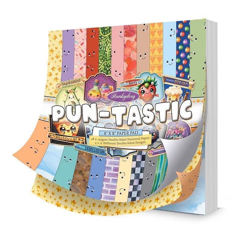 - The Pun-tastic 8” x 8” Paper Pad features 48 double-sided pages packed full of colourful and funky patterns. Covering a wide range of playful patterns such as stars, clouds, hearts, dots, stripes to name a few for the front side of the pages. Featuring a super cute smiley face pattern in a range of colours on the back of each page, this pad is the perfect extension to your main topper collection and is such good value.