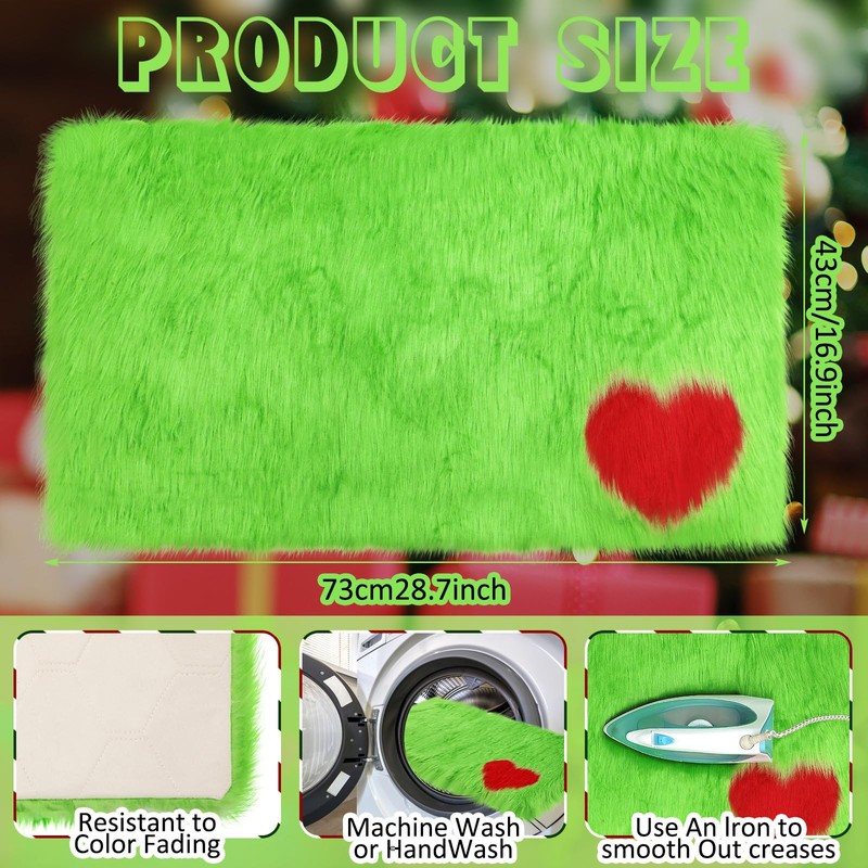 HunnmingRe Lime Green Furry Christmas Mat with Red Heart Pattern Green Rugs for Bedroom Living Room Decor, Washable Soft Fuzzy Rug, 16.9 x 28.7 Inch