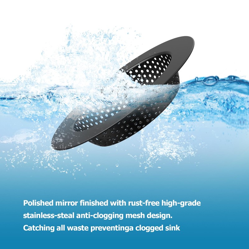 - [KITCHEN SINK DRAIN STRAINER] Made of 304 stainless steel, rust-free, and overall thickening, which is more sturdy, durable and not deformed. Designde with 0.08 inch drain pore and large basket for collected food particles and debris. The drain strainer can keep draining smoothly even after it full catchered.Perfect for US standard kitchen sink drains (3-1/2" / 3-3/8" / 3-1/4").