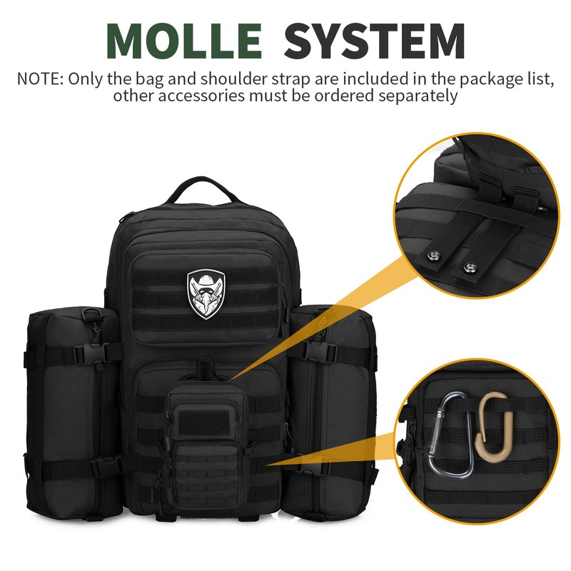- Molle System: Connection with the MOLLE system, you can easily use with the load on the large package, make your backpack more personalized and practical, but also can be hung on a belt.