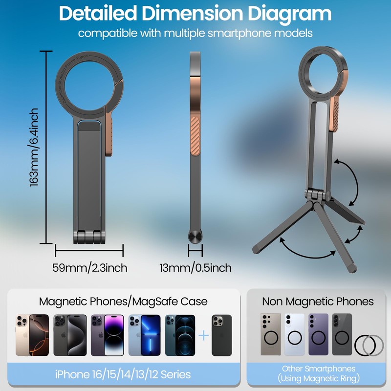 - Universal CompatibilityThis mini tripod is fully compatible with iPhone 16/16 Plus/16 Pro/16 Pro Max, 15/15 Plus/15 Pro/15 Pro Max, 14/14 Plus/14 Pro/14 Pro Max, 13/13 mini/13 Pro/13 Pro Max, and 12/12 mini/12 Pro/12 Pro Max, and it also works with magnetic cases. A magnetic ring is included for phones without built-in magnetic support.
