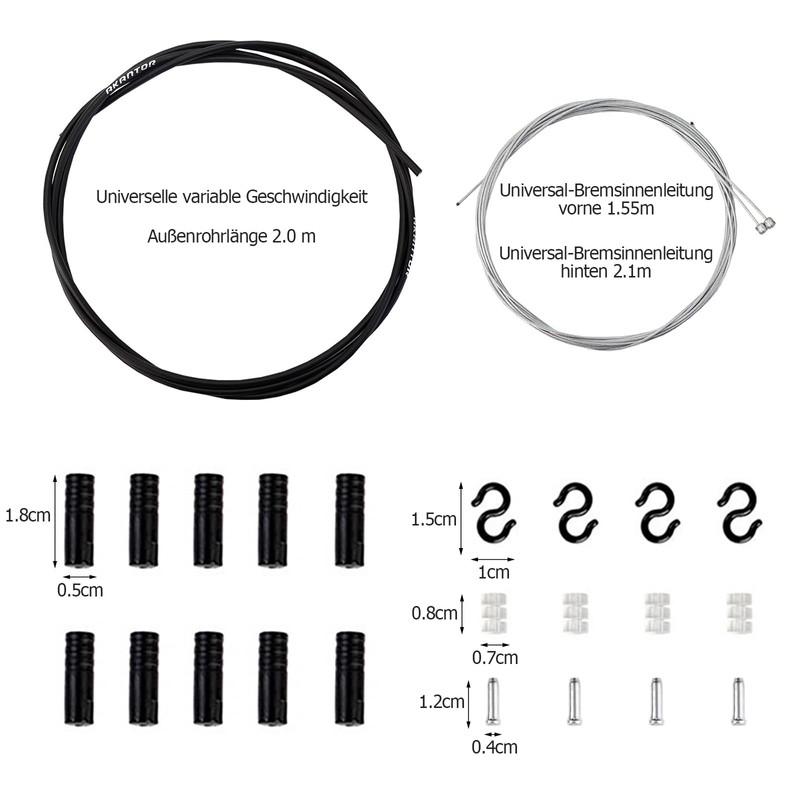 - Easy adjustment and installation: thanks to the pre-cut lengths (e.g. B. 2.5 m brake cable cover, 2 m gear cable case) and extensive accessories, the set can be individually cut and easily assembled - including S-clamps, end sleeves and O-rings