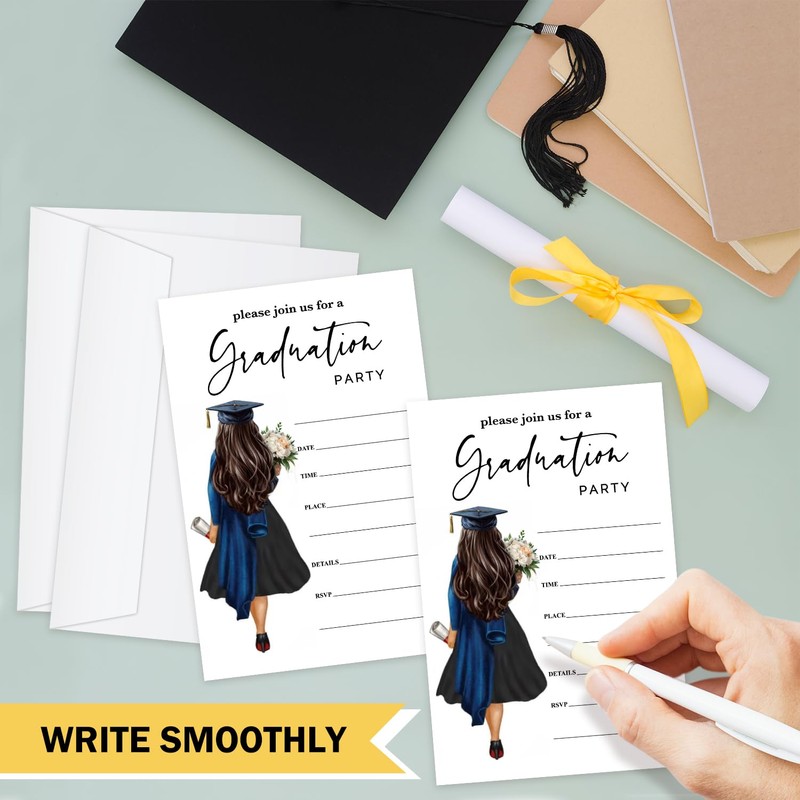 Perfect Size: Each set of 20 graduation party invitation with envelopes, cards measures approximately 4x6 inches and is easy to carry. These modern invitation cards are perfect for preparing for your party and add a lot of fun to your graduation party.Unique Design: The graduation invitation card has enough blank horizontal lines to write your graduation party information, including in honor of, date, time, place and RSVP, so the details of your graduation party will be very clear.Superior Quality: It uses high-quality paper, which is sturdy and durable. The card is relatively thick and not easily creased. By using advanced printing technology, the color and pattern of the invitation letter can be well presented. Write smoothly with any pen.Party Warm-Up: The classic design decorated with handwritten invitation cards will impress classmates, friends or family. Use these graduation-themed invitations to make your guests look forward to your graduation. The party gets everyone excited for the big day.