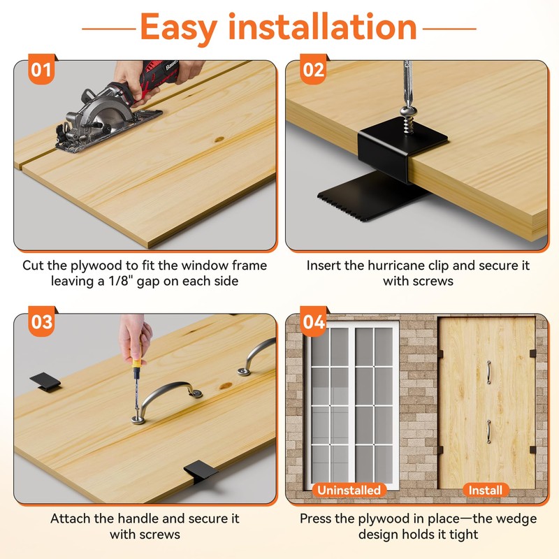 • What’s Included: Hurricane clips for plywood x16, handles x4, screws x24 (16 for clips, 8 for handles)