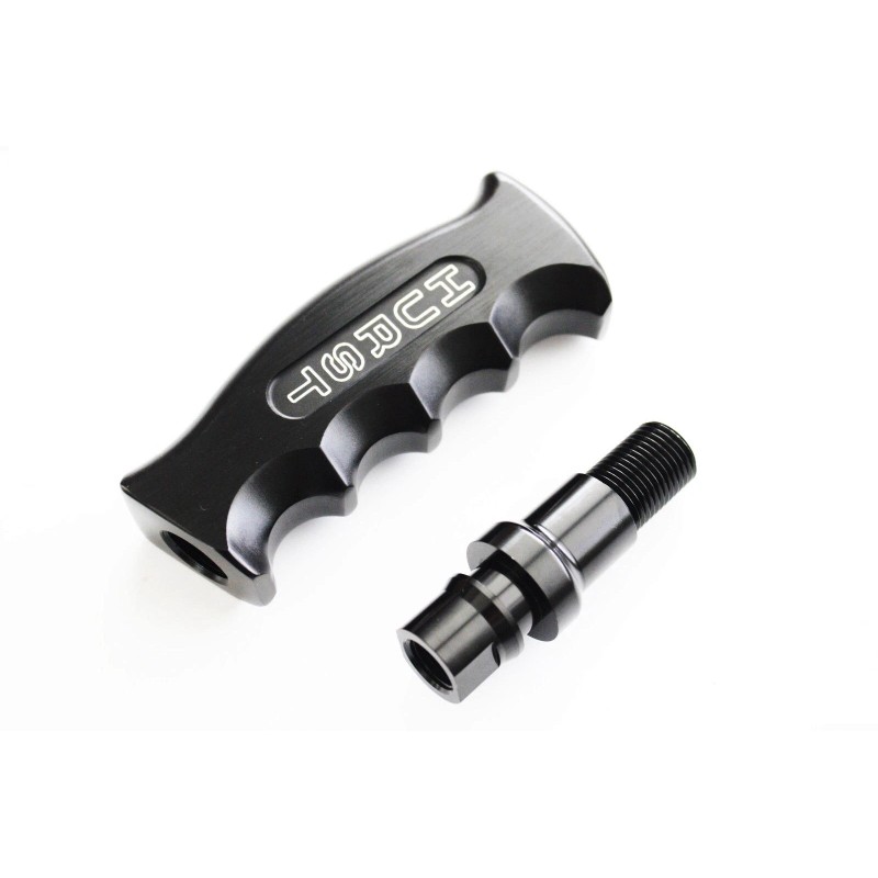 - Black-anodized CNC-machined billet aluminum adapter that threads into handle and onto stock stick (use w/ stock jam nut)
