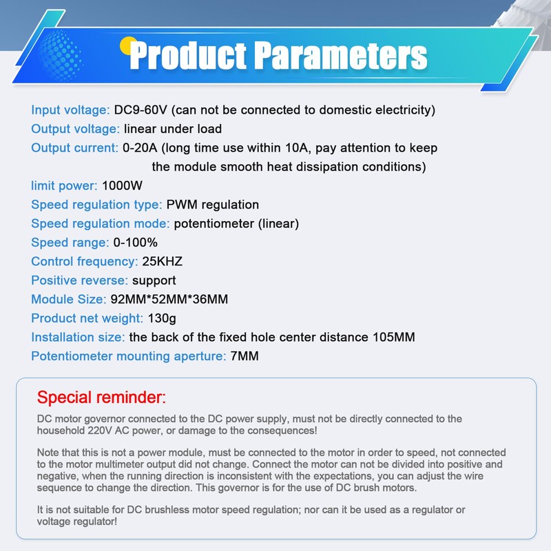 - Speed Switch Control: Our Motor Control Board Can Adjust The Motor Speed by Potentiometer; Speed Adjustment Range (0%-100%), with Switch Function Can Realize Clockwise/counterclockwise Rotation Adjustment. Working Voltage (DC9V-60V), Control Current (0-20A).Continuous Power: 1000W