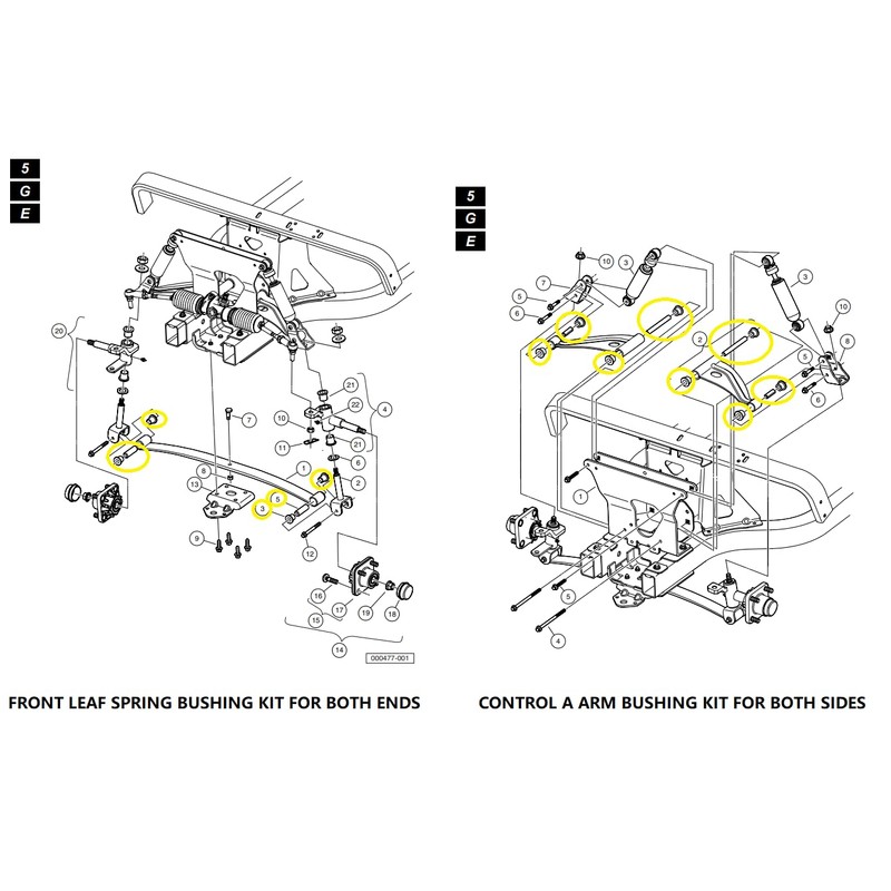 - OEM reference: 12x Front end Urethane bushings 1029562-01 / 1022874011; 2 Sleeves 102288101 (for front leaf spring); 2 Inner Sleeve 102287701 2 Outer Sleeves 1102287601 (Control Arm Sleeves); Rear leaf spring Sleeve Part No#: 1025064-01 and Rear end Bushing Part No#: 1025066-01.