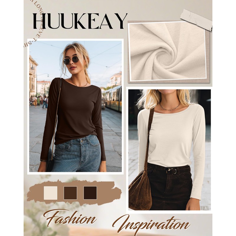 Huukeay 3 Pack Women's Long Sleeve T-Shirts, Boat Neck Basic Cotton Shirts Casual Loose Fit Tops Fall Comfy Outfits 2025(Cream, Coffee, Dark Brown,XX-Large)
