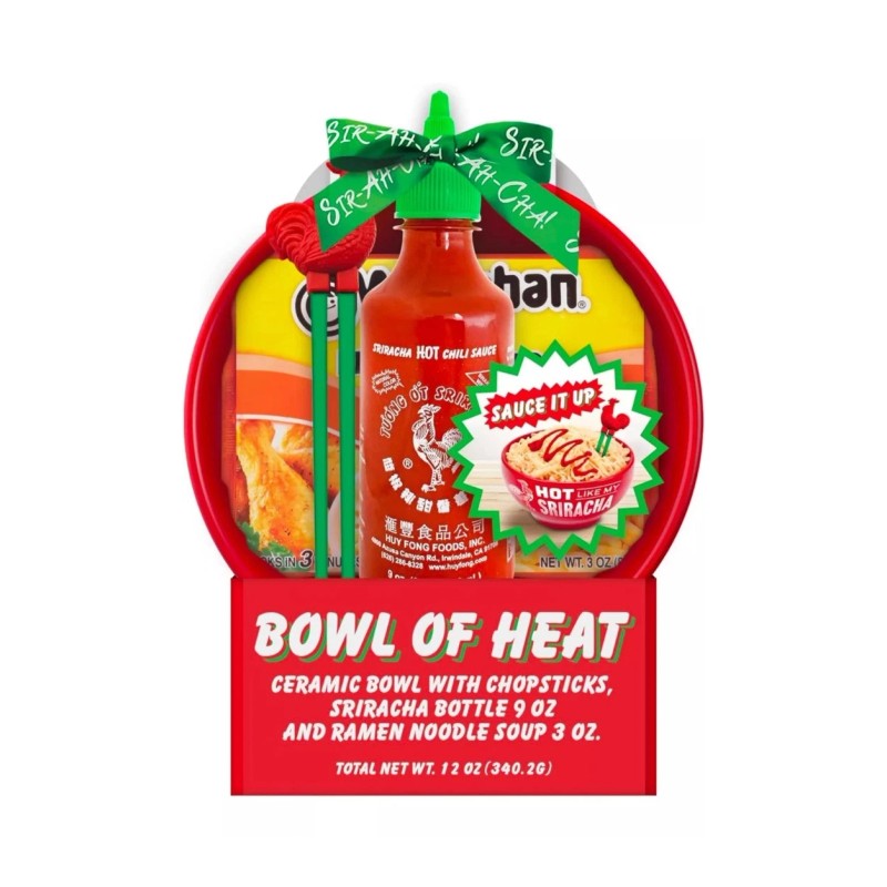 The product is a Sriracha Bowl Of Heat Hot Sauce Gift Set by Huy Fong Foods. The set includes a bottle of BBQ & Hot Sauce with a best by date of 9-2025, along with a bowl, chopsticks, and other accompanying items. This item can be found in the Pantry food aisle and is categorized under Condiments & Sauces and Other Sauces.
