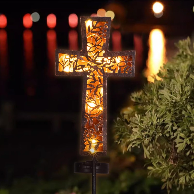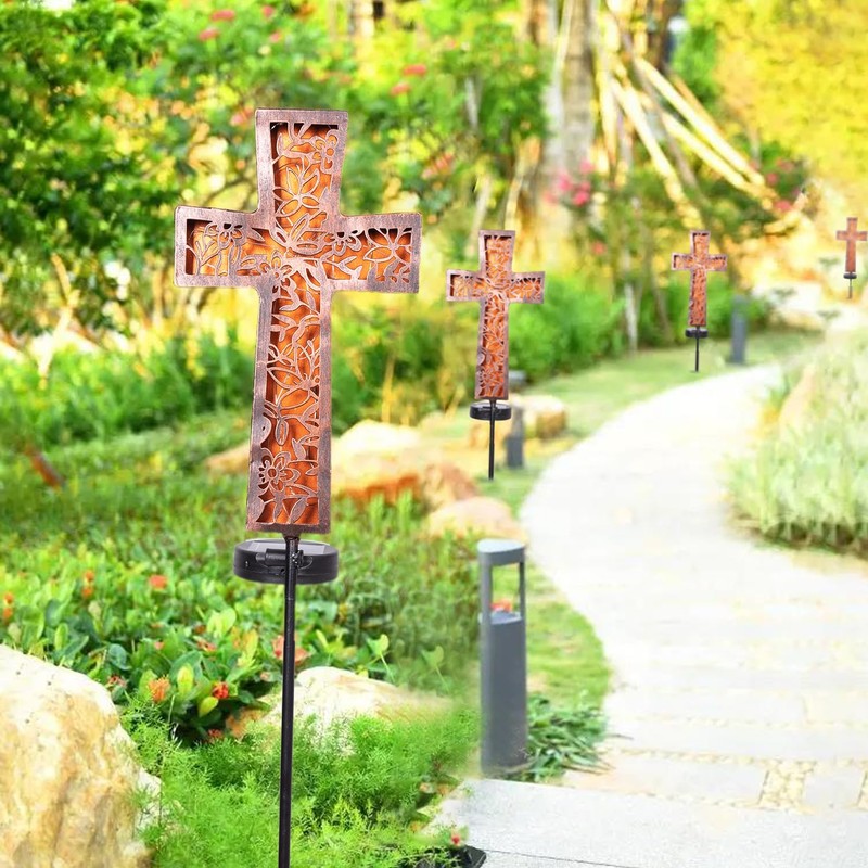 - Solar Garden Stakes-Traditional Cross Stakes with 26pcs mini LED makes the solar light a eyecatching addition for your garden, flowerbed, walkway. This solar cross stake light is a great way to honor loved ones and to decorate a memorial.
