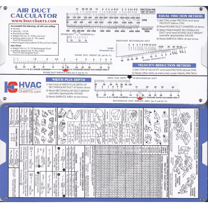 Back of calculator has equivalent feet of straight duct for commonly used fittings, corrected pressure drop chart, and many HVAC formulas.