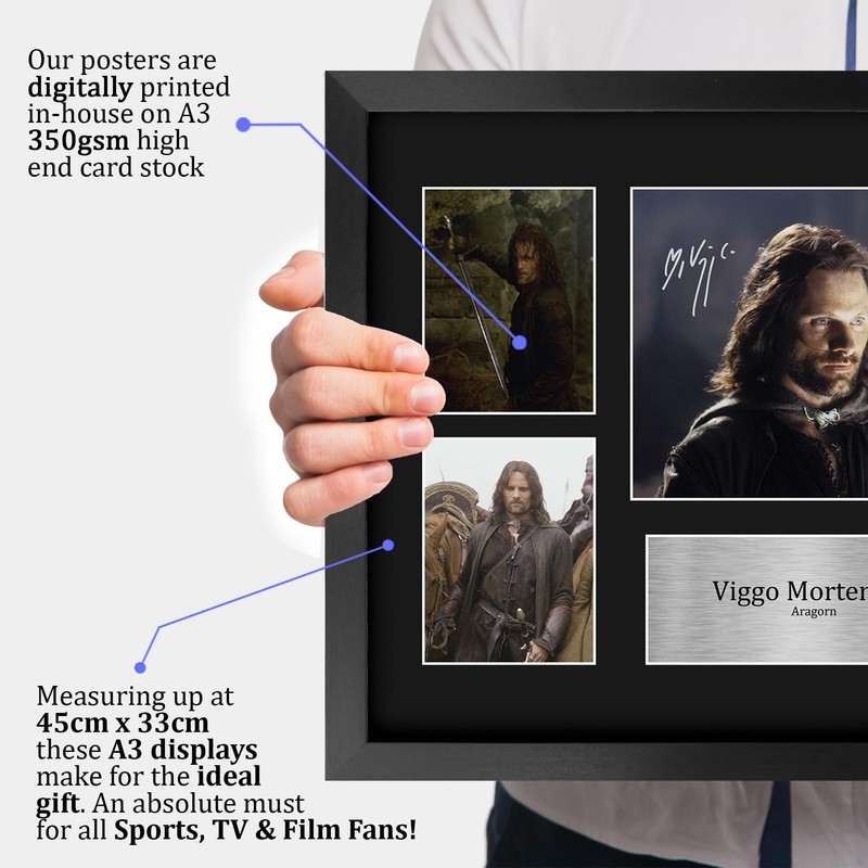 Professionally made in our studio, this A3 (330x445mm) framed Viggo Mortensen display makes for an ideal gift idea. This laser printed quality photograph is mounted in a precision cut six windowed acid-free matt black display board. To the left and right of the display there are four classic images. To the centre of the display a main focal image taking pride of place with printed signature overlay. Below this is a metallic effect plaque area with the name and career information. This item comes framed in a sleek black polycarbonate frame that compliments the matt mount display and a clear perspex front to keep it dust free and clean. Lightweight, but of the highest quality, these make the ideal Christmas/Birthday gift for fans of all ages, and best of all, it definitely won't break the bank!