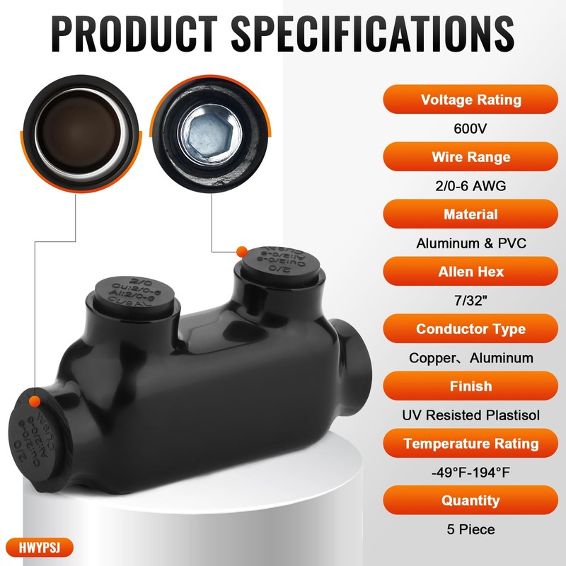 HWYPSJ 2 Port Inline Splice Connector 2/0-6 AWG Aluminum to Copper Wire Connectors Single-Sided Entry Aluminum Wire Connectors Slotted Allen Hex - 5 Pack
