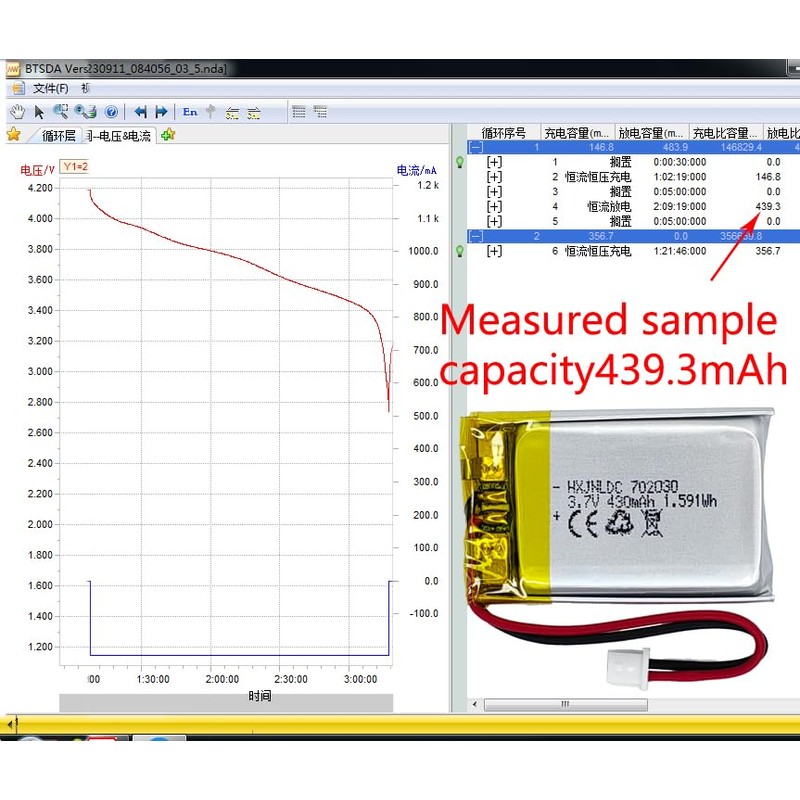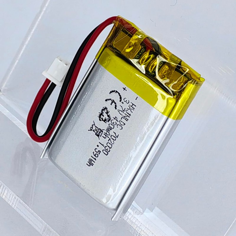 - 702030 rechargeable lithium ion polymer battery, nominal voltage 3.7V, full charge voltage 4.2V, capacity 430mAh, power 1.591Wh, ★size 30.5×20×7mm(1.2×0.787×0.276inch)(L*W*T), Weight:7.5g(0.265oz),Maximum current:0.43A。 It can prevent overcharge, overdischarge, overcurrent, and short circuit.