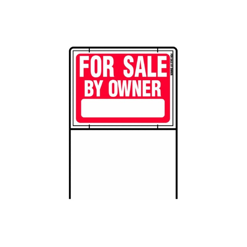 Weather resistant. Double-sided, bold lettering maximizes visibility. Sign comes attached to frame; no installation necessary. Red background with white lettering. Sign states "FOR SALE BY OWNER".