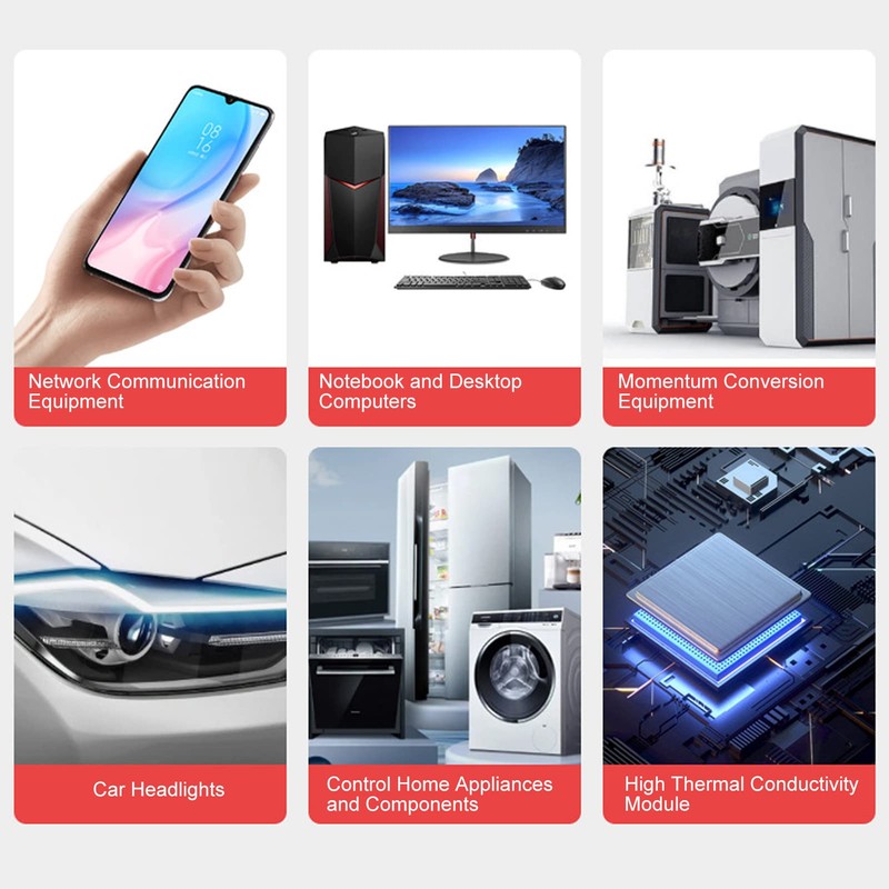 Applicable accessories: suitable for PC components such as CPU, VGA, chipset, etc. Applications: for network communication equipment, notebooks and desktop computers, power conversion equipment, car headlights, household appliance control, components, high thermal conductivity modules.