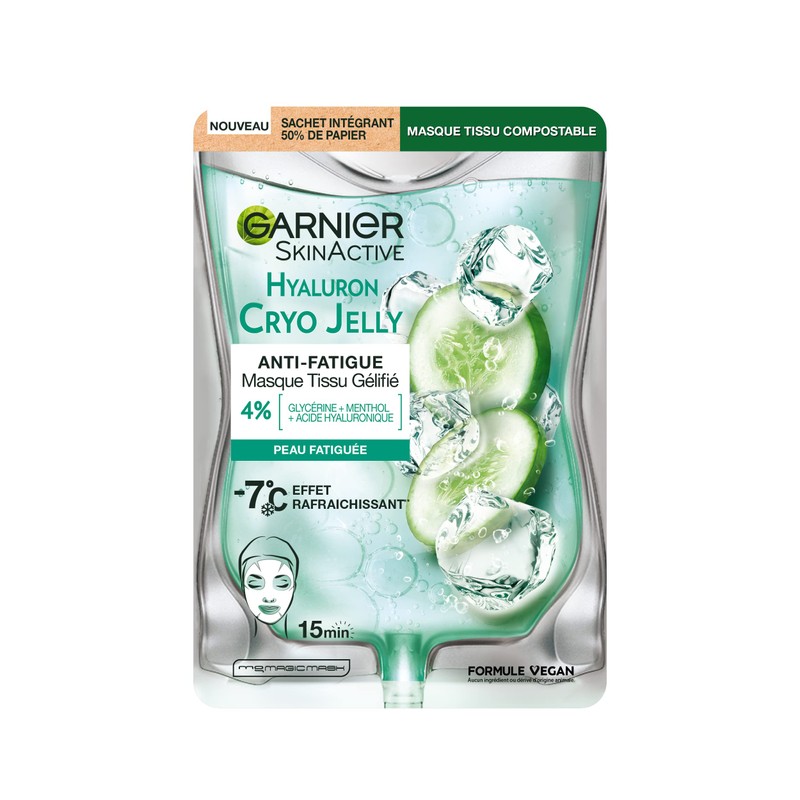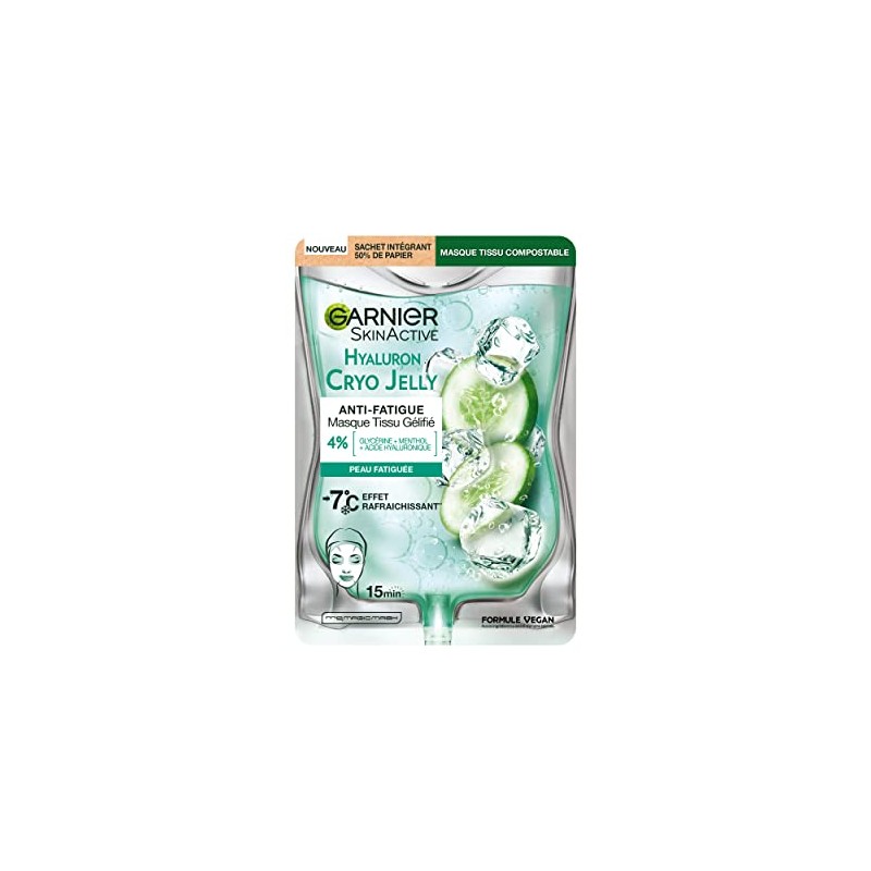 The SkinActive Hyaluron Cryo Jelly Anti-Fatigue Gel Cloth Mask from Garnier is a vegan formula with glycerin, hyaluronic acid and menthol and promotes a fresh and tightened look of the skin. Thanks to the cooling effect, the facial skin is cooled down by up to 7°C with the gel-like cloth mask and moisturised. Signs of fatigue are visibly reduced. With the Garnier SkinActive Hyaluronic Cryo Jelly Anti-Fatigue Gel Cloth Mask, signs of fatigue are visibly reduced thanks to cooling effect and the skin appears more refreshed. The cloth mask soaked in gelled serum contains valuable ingredients such as gylercin, hylauron and menthol, which moisturise the facial skin. At the same time, it provides a refreshing, cooling effect, as the skin is cooled down by up to -7°C by the Cryo Jelly anti-fatigue gel cloth mask. Did you know? The gel-like cloth mask clings to the facial contours like a second skin. The Cryo Jelly anti-fatigue gel cloth mask at a glance: cooling effect, vegan formula with glycerine, hyaluronic and menthol, moisturises, reduces signs of fatigue. For firmer, refreshed facial skin. Sustainability is an extremely important topic at Garnier This also includes social engagement as well as more environmentally friendly formulations. Garnier is also increasingly focusing on the use of recycled materials as well as on the use of renewable energy. For the application of the Hyaluron Cryo Jelly anti-fatigue gel cloth mask, first thoroughly clean the face. Then unfold the mask and place it on the face. Gently adjust to the contours of the face. After 15 minutes of exposure time, remove the cloth mask. Gently massage excess residue into the skin or alternatively remove with a cotton pad. The cooling and firming mask is suitable for regular use. 967601 03 – Ingredients: aqua/water glycerine propanediol butylene glycol pentylene glycol caprylyl / caprylic glucoside CI 19140 / yellow 5 CI 42090 / blue 1 citronello cumial. S S SATIVUS Fruit Extract/CUCUMBER FRUIT EXTRACT DIPOTASSIUM GLYCYRRHIZATE GLYCERYL ACRYLATE/ACRYLIC ACID COPOLYMER HYDROXYACETOPHENONE LIMONENE LINALOOL MENTHOL PHENOXYETHANOL PVM/MA COPOLYMER SODIUM HYALURONATE SODIMOMOMOMOMOMORYLATE SODIUM POLYACRYLATE STARCH XANTHAN GUM PARFUM / FRAGRANCE (F.I.L. Z70012829/1).