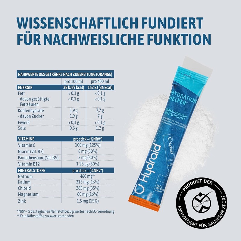 Rehydrate smarter with Hydraid Hydration Helper® Orange, the science-backed electrolyte powder crafted for quick fluid recovery and sustained performance. Each stick delivers 1118 mg of electrolytes with just ~2g sugar per 100ml—60% less sugar than conventional sports drinks.
