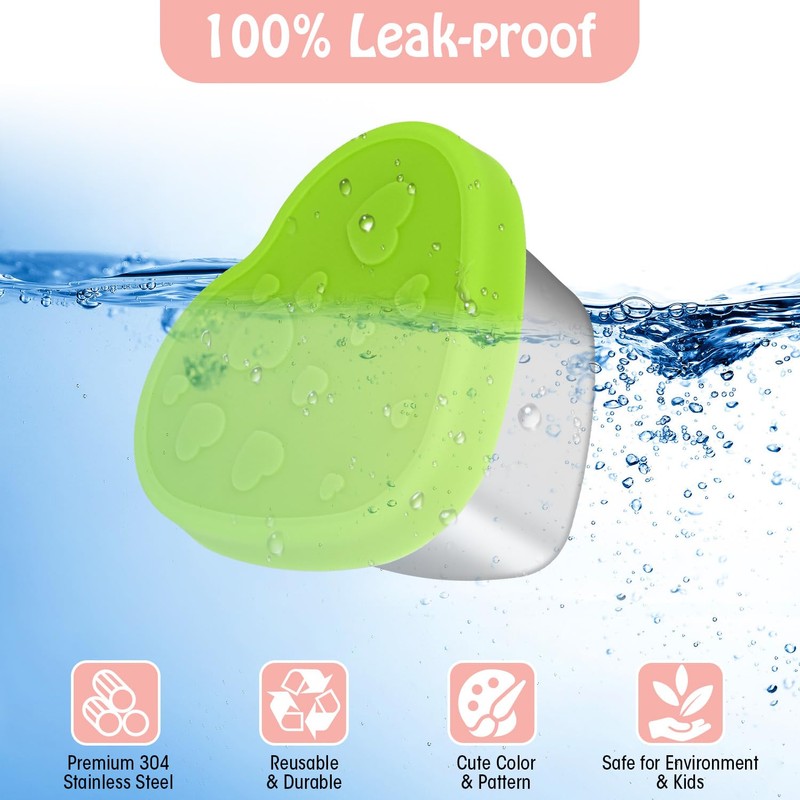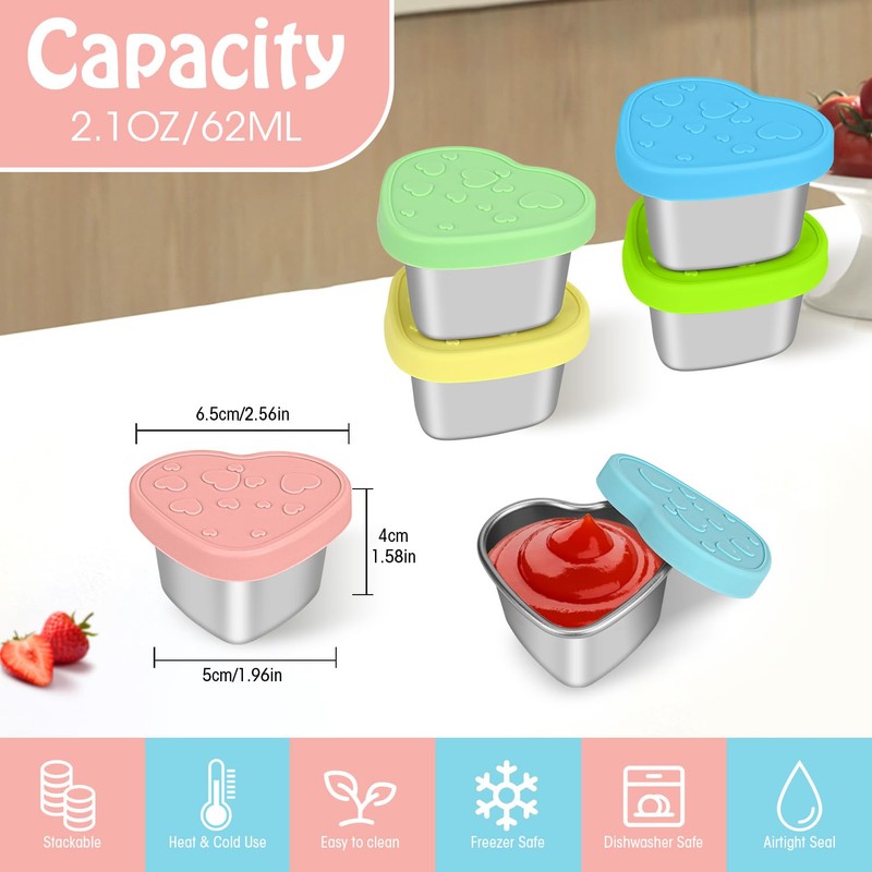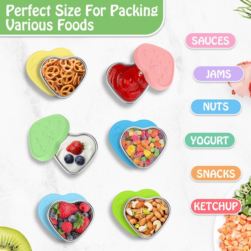 - Easy to open lids for colourful salad dressing containers: the silicone lids of the mini sauce container are soft and make the stainless steel spice cup very easy to open. The different colour makes it easy for you to distinguish the sauces. It just fits perfectly for picnics, summer camp and travel.