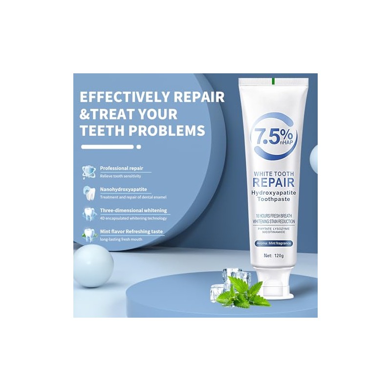 - Whitening Teeth Repair: Gently removes stains and yellowing on the tooth surface through the abrasive effect of tiny particles, restoring the natural luster of teeth