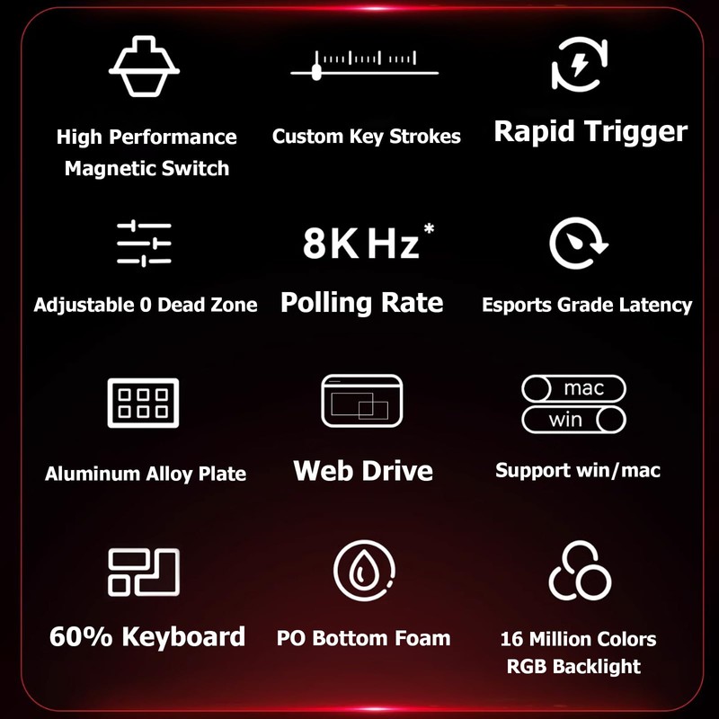 - ADJUSTABLE ACTUATION: The MAD60 HE comes with a proprietary web-based driver that allows users to easily remap keys, set up macros, and customize lighting effects