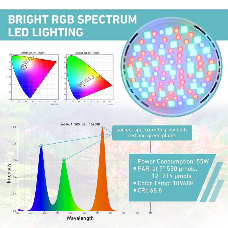 • PAR & Specifications: Power: 55 watt, PAR: at 7” 530 μmols, 12” 214 μmols. PAR readings of 200 μmols and above is considered high light and will support sustainable growth in High lighting demanding plants. Perfect for Aquascaping, Planted Tanks, Fish Displays, Shrimp tanks, Terrariums and Paludariums. Luminous Flux: 17500 Lumens, Color Temperature: 10968K. CRI: 68.8. Beam Angle: 120°