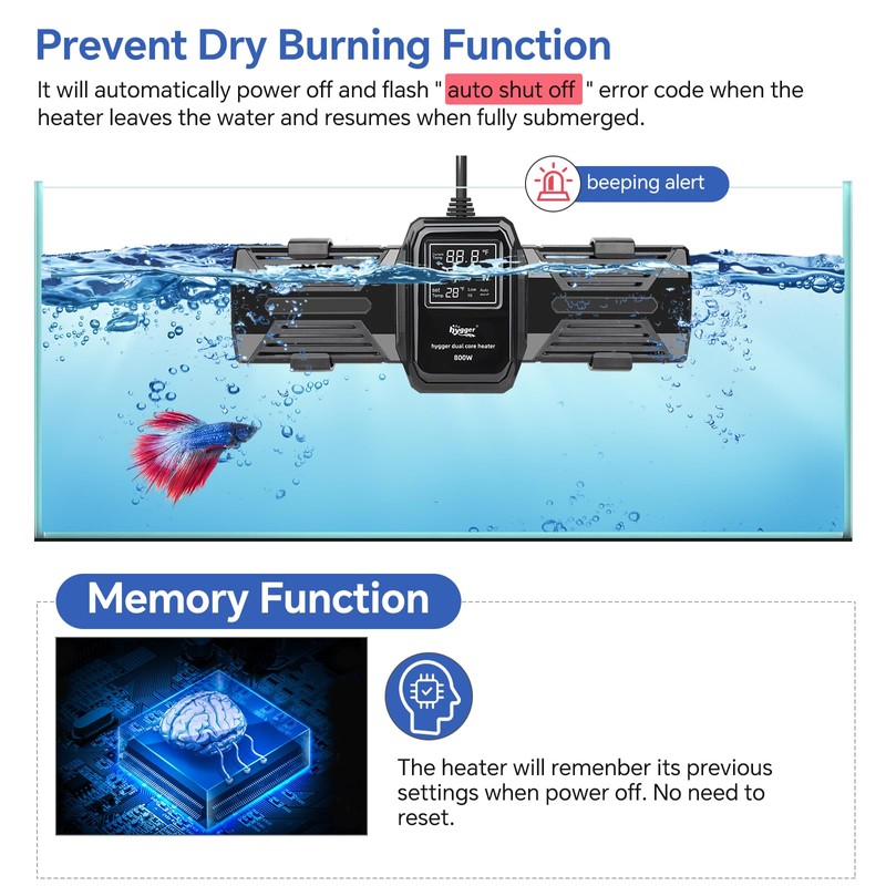 - 【Overheating/Low Temperature/Dry Running Protection】Our aquarium heater has three intelligent protectors: ①Overheating: When the water temperature exceeds 93°F, the heater displays the error code “HH”, and automatically stops heating. ②Dry running: When the heater outs off water, “Auto shut off” will flash and automatically cuts off the power. ③Low temperature : When the temperature is below 59 °F, it will display “LL” and continue heating. Multiple protections to get rid of "boiled fish"!