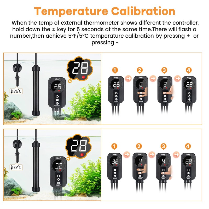 - Temperature Calibration:When the temperature of the controller is different from the temperature measured by the external temperature, the temperature can be calibrated by pressing the three keys "set", "+" and "-", and the temperature compensation is set according to the actual error! The maximum compensation range is ±5℃. This function can help you set the temperature more accurately, let the heater work better, and always maintain a comfortable temperature for your beloved fish