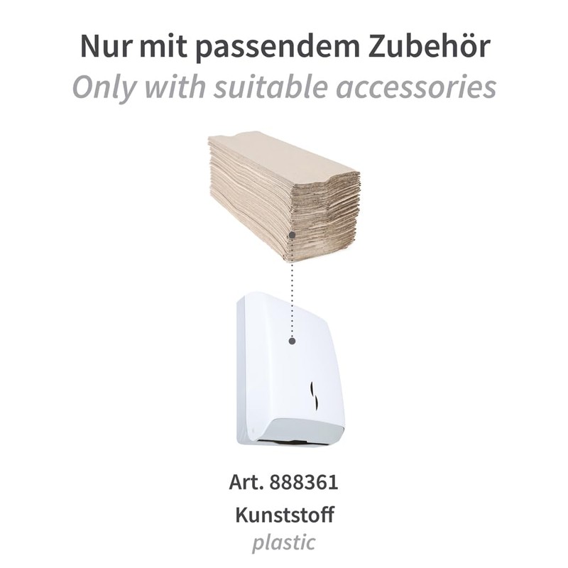The 1-ply paper towels in C-fold are made from 100% recycled paper and are therefore a resource-saving, particularly environmentally friendly version. C-fold paper towels basically have a large sheet size (25 x 32 cm) and can also be used when folded. Another advantage of the C-fold is that no cloth residue protrudes and thus all cloths remain completely and clean in the dispenser. Matching folding towel dispenser and wall holder for disposable paper in C-fold are available here in the shop - best to order at the same time.