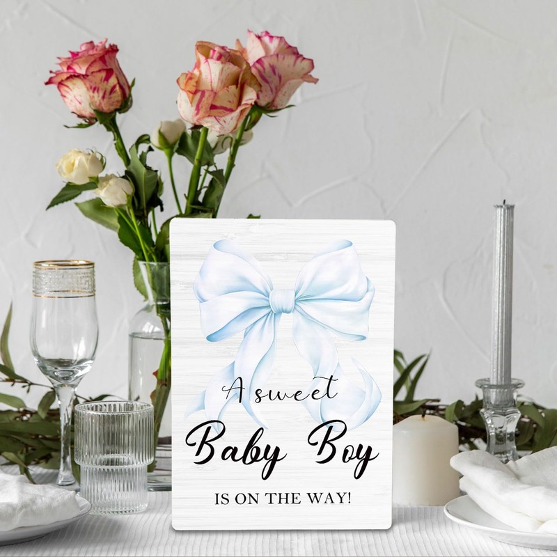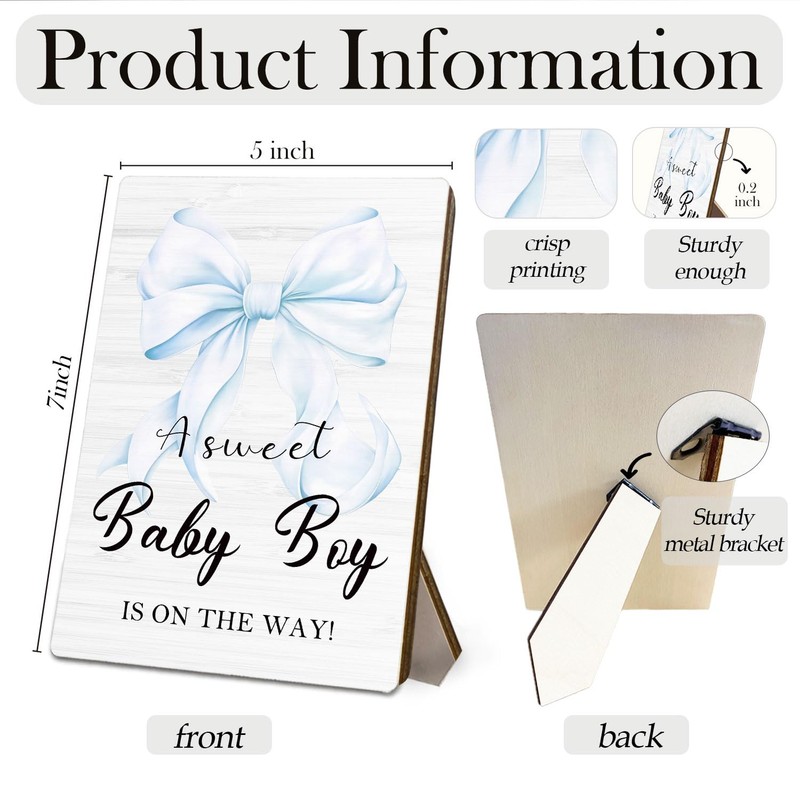 HYKDFMNCJ Baby Shower Wooden Signs, Sweet Boy Welcome Sign Stand 5x7 Inch, Baby Shower Centerpieces For Boy, Blue Bow Decorations
