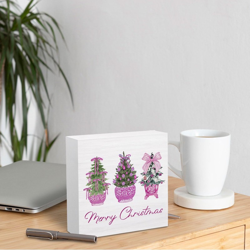 HYKDFMNCJ Coquette Bow Chinoiserie Christmas Tree Wooden Box Sign Desk Decor, Purple Christmas Decor, Grandmillennial Preppy Xmas Wood Signs for Home Office Desk Table Shelf Decorations, 5x5 Inch